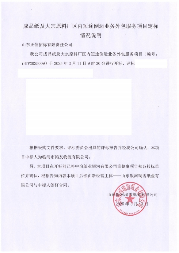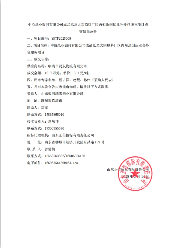 中冶紙業銀河有限公司成品紙及大宗原料廠區內短途倒運業務外包服務項目成 交結果公告 作者:管理員 來源:項目 點擊:次 字號:大中小 上一篇:山東裕龍石化有限公司裕龍島煉化一體化項目(一期)生產期焊材框架采購項目 中標候選人公示 下一篇: 杭州市路橋集團股份有限公司聊城整車試驗道路及動態測試場地項目2025年勞務分包服務招標項目 中標候選人公示 分享到:QQ空間新浪微博騰訊微博人人網分享到微信朋友圈! ? ?